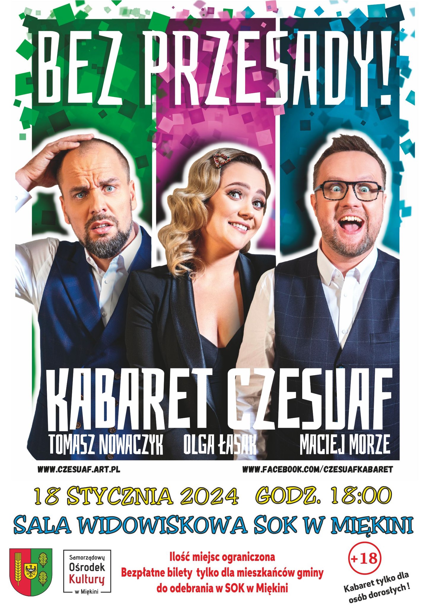 Już 18 stycznia na scenie SOK wystąpi Kabaret Czesuaf z nowym programem "Bez przesady! Bezpłatne bilety, wyłącznie dla mieszkańców gminy Miękinia, są dostępne do odebrania w SOK.