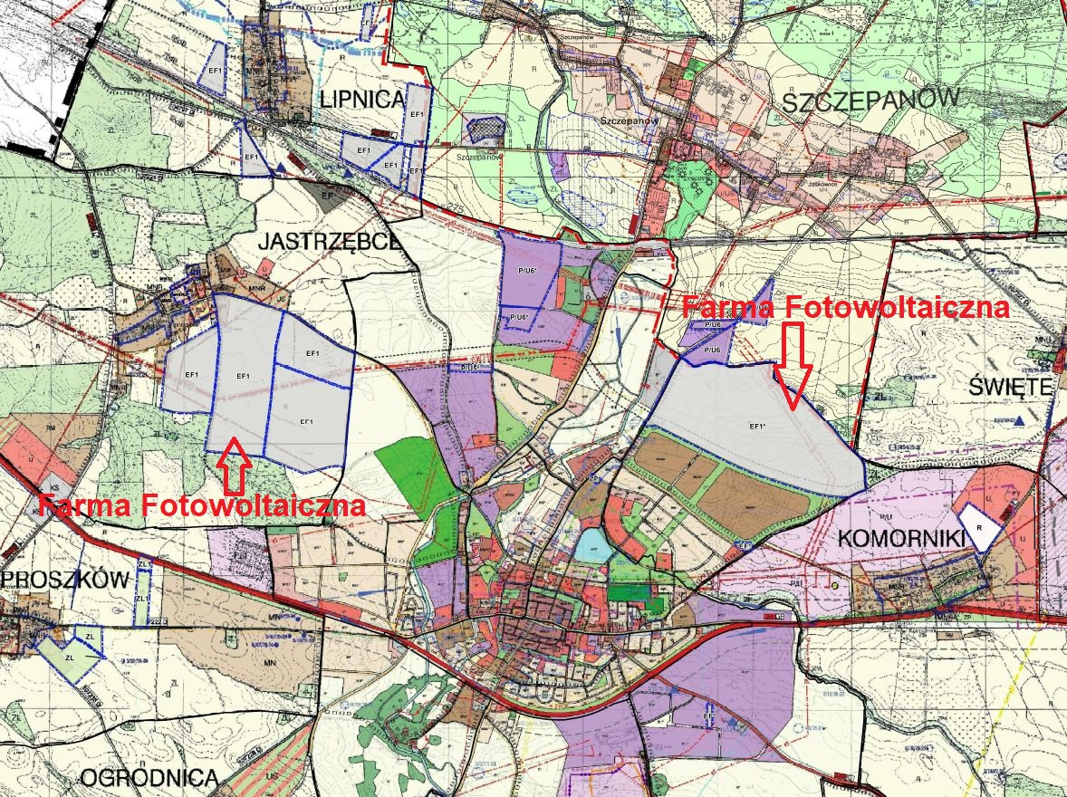 Szczególne wątpliwości budź plan zmiany przeznaczenia z rolniczego na tereny lokalizacji urządzeń fotowoltaicznych o mocy przekraczającej 500kW w obrębie Środy Śląskiej działka nr 2/26 o powierzchni ponad 95 ha na Winnej Górze naprzeciwko Średzkiej Wody oraz planowanego do budowy osiedla Polskich Domów Drewnianych (na trasie planowanej do budowy północnej obwodnicy Środy Śl. ) A także w obrębie Jastrzębce dz. nr 247, 244, 239, 240 o powierzchni niemal 130 ha jadąc od środy Śląskiej do Jastrzębiec działki po lewej stronie za terenem zabudowanym (zgodnie z załącznikiem graficznym). Powyższe działki już dzisiaj niemal bezpośrednio sąsiadują z terenami zabudowanymi i stanowią istotny element przyszłego rozwoju i rozbudowy Środy Śląskiej. Przeznaczenie tych terenów pod farmy fotowoltaiczne z jednej strony zablokuje możliwość rozbudowy miasta w perspektywie najbliższych dziesięcioleci z drugiej zaś bardzo negatywnie wpłynie na tereny sąsiadujące i krajobraz.