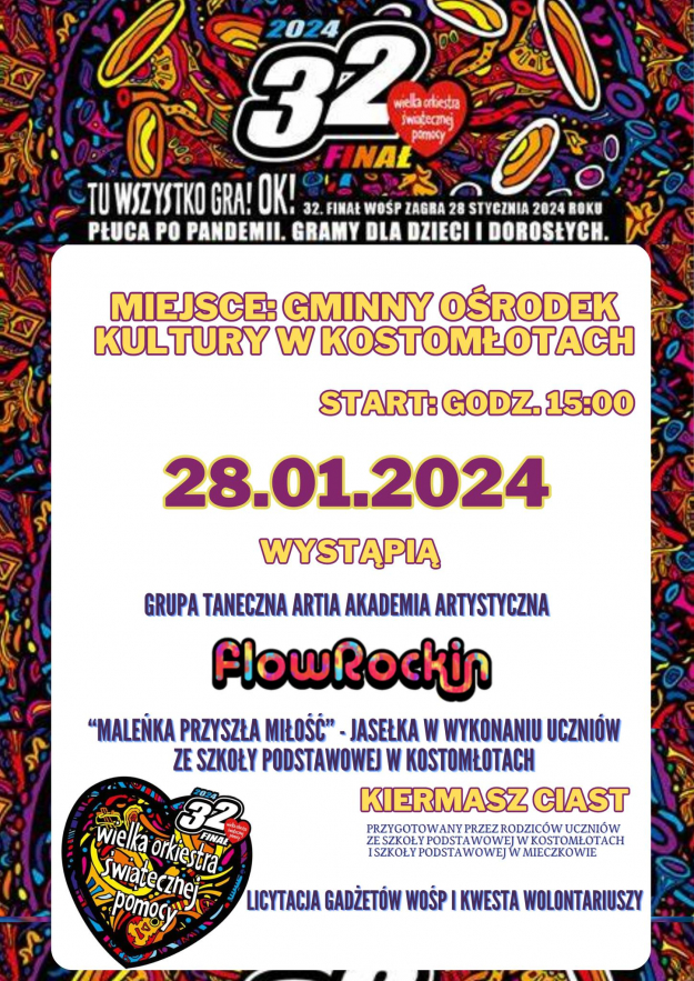 Start wydarzenia w Gminnym Ośrodku Kultury w Kostomłotach o godzinie 15.00. W programie artystycznym m.in. występy grupy tanecznej Artia Akademia Artystyczna, FlowRockin czy jasełka "Maleńska przyszła miłość" w wykonaniu wuczniów ze szkoły podstawowej w Kostomłotach. Tradycyjnie nie zabraknie kiermaszu ciast, WOŚPowych licytacji i kwesty wolontariuszy.