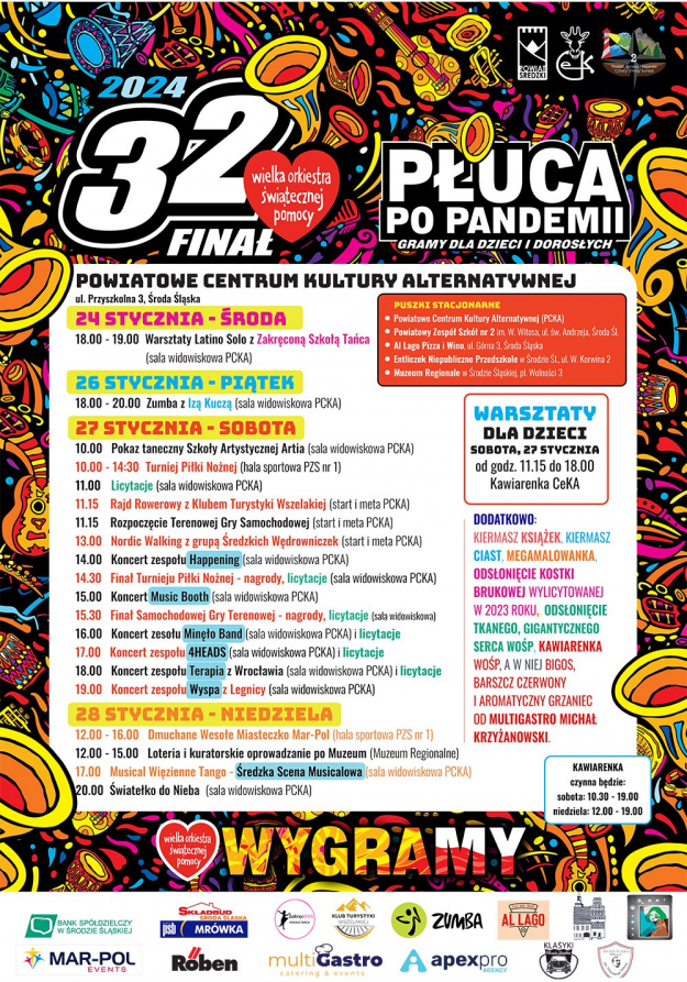 Na środę 24 stycznia zaplanowano warsztaty latino solo z Zakręconą Szkołą Tańca. W piątek 26 stycznia w sali widowiskowej możecie wziąć udział w zumbie z Iza Kuczą. Moc atrakcji znajdziecie w sobotę przed finałem. Tam między innymi turniej piłki nożnej, rajd rowerowy czy marsz nordic walking. Oczywiście nie zabraknie koncertów, a na scenie Powiatowego Centrum Kultury Alternatywnej staną Happening, Music Booth, Minęło Band, 4HEADS, Terapia z Wrocławia czy Wyspa z Legnicy. Ważnym punktem sobotniego grania z WOŚP jest Terenowa Gra Samochodowa, o której więcej dowiecie się [TUTAJ].