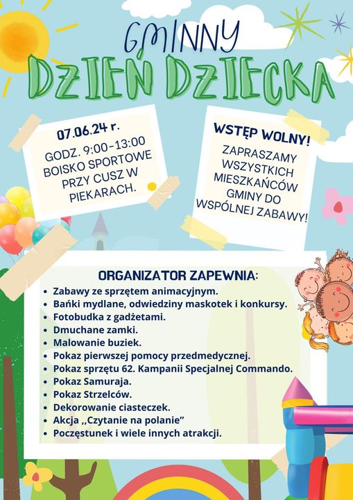Serdecznie zapraszamy do udziału w Gminnym Dniu Dziecka, który odbędzie się 7 czerwca 2024 r. w godzinach 9:00-13:00 na boisku sportowym przy Centrum Usług Społeczno-Zdrowotnych w Piekarach.