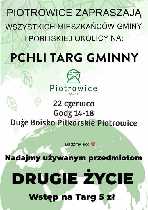 Mieszkańcy Piotrowic zapraszają wszystkich mieszkańców gminy i pobliskich okolic na Gminny Pchli Targ, który odbędzie się 22 czerwca na boisku sportowym w Piotrowicach w godzinach 14:00-18:00. Nadaj przedmiotom drugie życie.