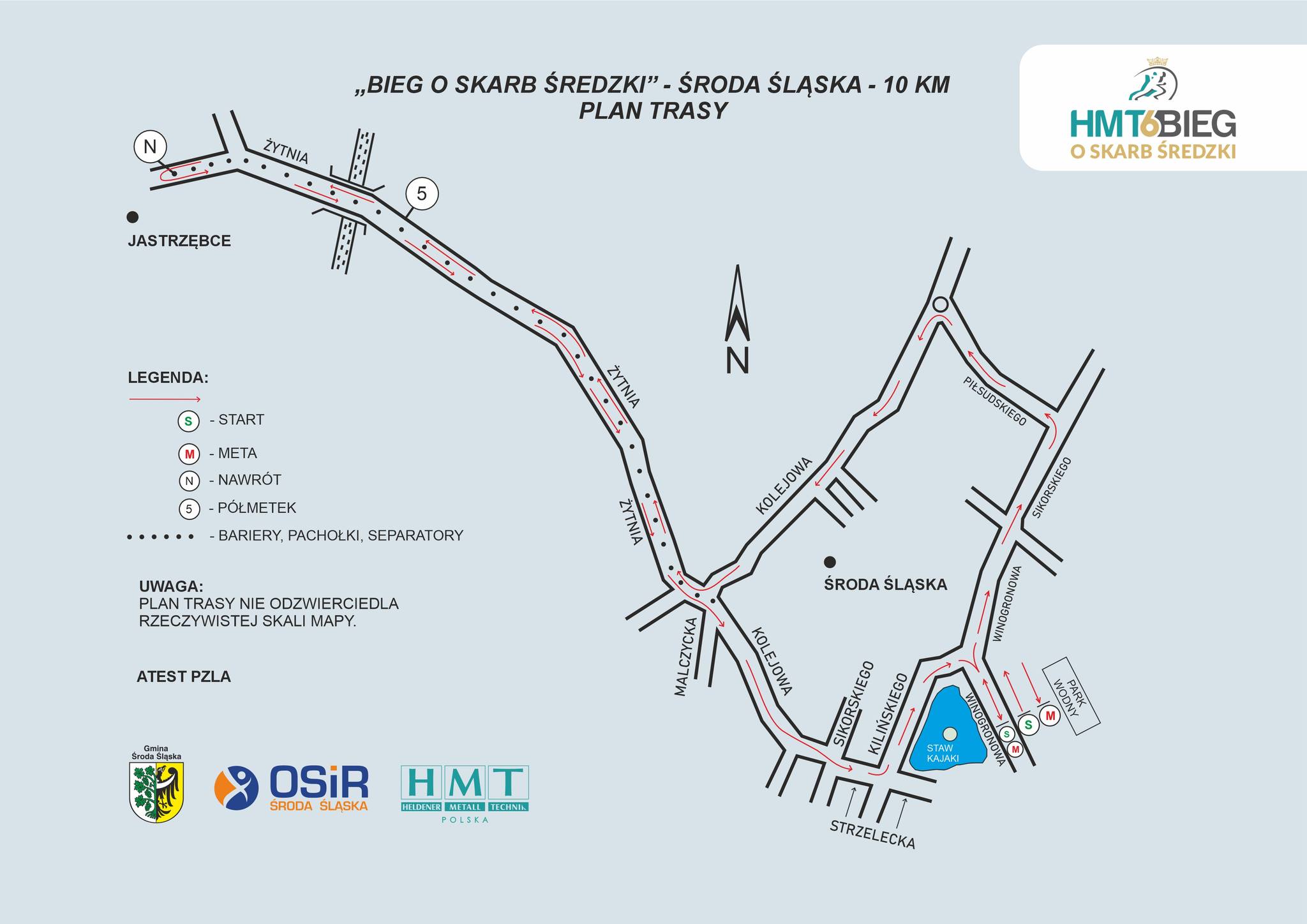 - dystans HMT VI Biegu o Skarb Średzki wynosi 10 km (1 pętla), trasa posiada atestację PZLA,