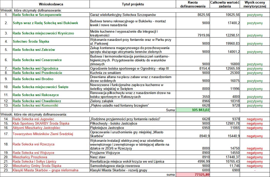 Do naboru zgłoszono 23 projekty, jeden odpadł na etapie oceny formalnej. Ostatecznie komisja konkursowa wyłoniła 13 wniosków, które otrzymają dofinansowanie w łącznej kwocie 105 843,02 zł .