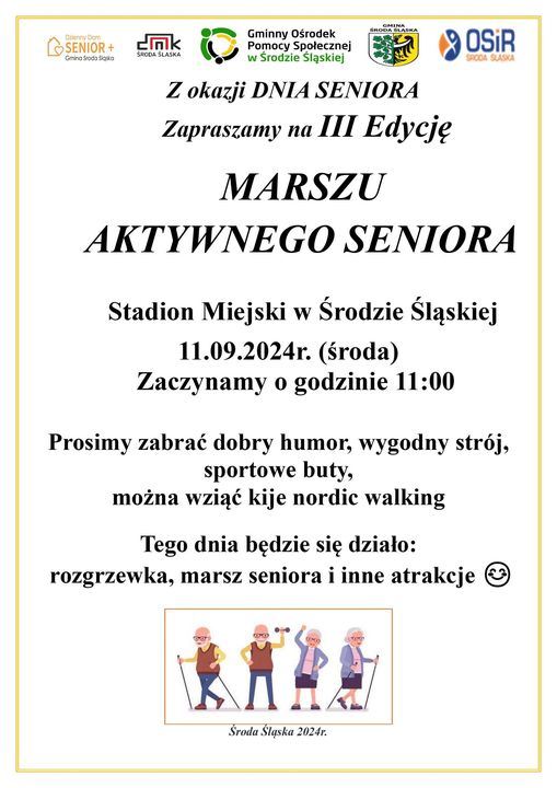 11 września 2024 o godz. 11:00 na Stadionie Miejskim w Środzie Śląskiej odbędzie się III edycja "Marszu Aktywnego Seniora".