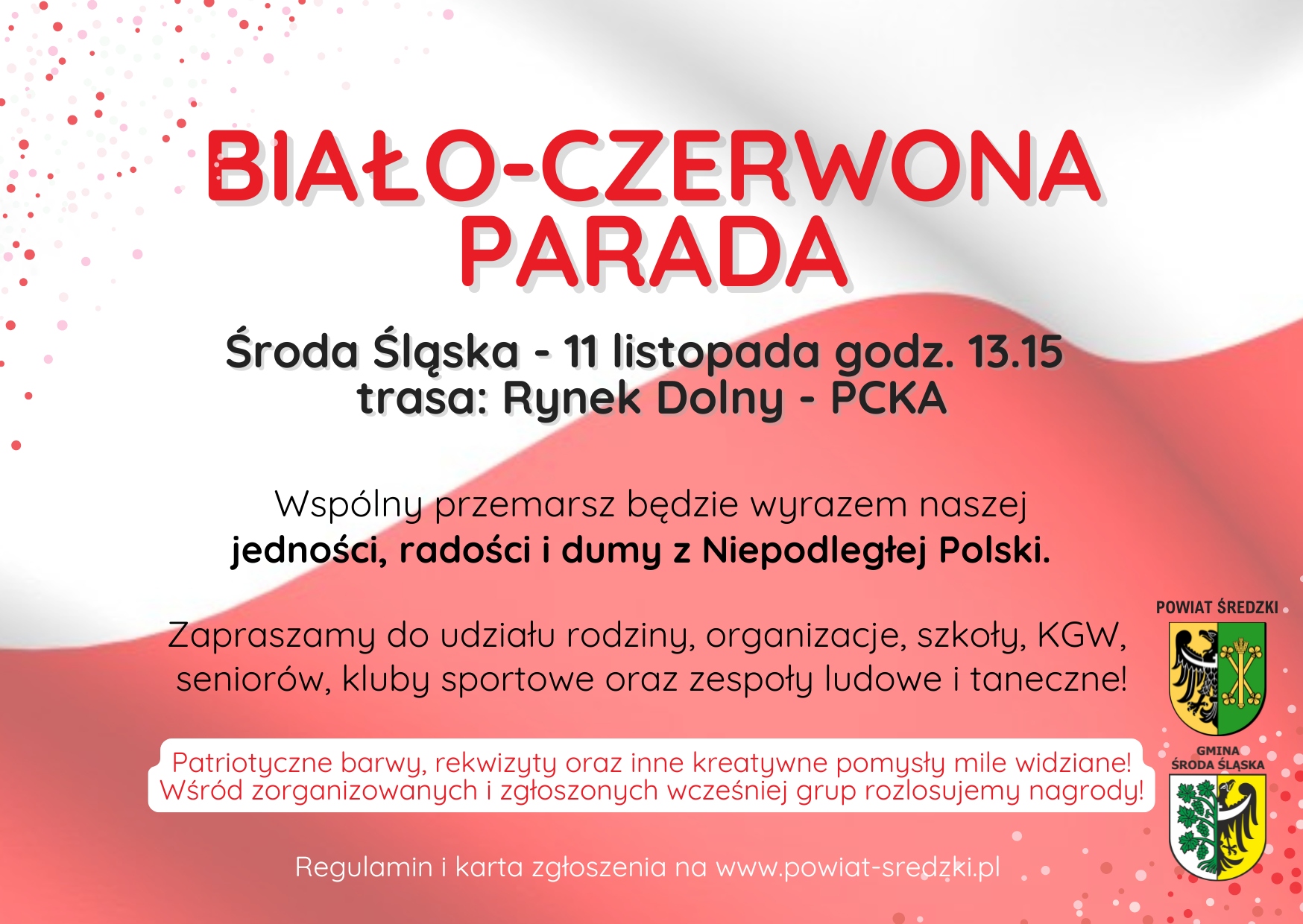 Chwilę później z rynku wyruszy biało-czerwona parada, której celem będzie Powiatowe Centrum Kultury Alternatywnej. Tam odbędzie się koncert "Razem śpiewamy polskie przeboje" w wykonaniu Pawła Wenderskiego.