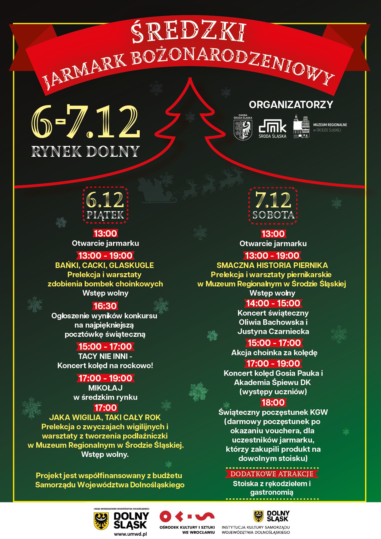 Gmina Środa Śląska wraz z Domem Kultury i Muzeum Regionalnym w Środzie Śląskiej już w weekend 6-7 grudnia zapraszają na wyjątkowy Jarmark Bożonarodzeniowy. Zapoznajcie się z programem wydarzenia i razem z nami poczujcie świąteczny klimat!