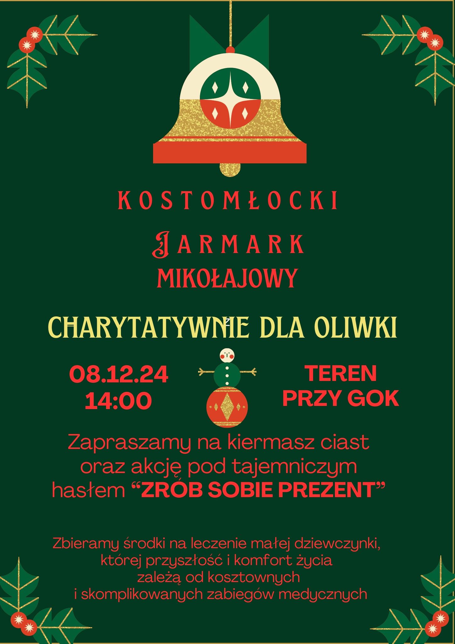 Zapraszamy Państwa do uczestnictwa w Jarmarku w Kostomłotach w dniu 8 grudnia od godz. 14:00, podczas którego na stoisku zorganizowanym przez Sołectwo Osiek i pracowników Samorządu Gminy Kostomłoty zbierać będziemy środki na leczenie Oliwki Malinowskiej z Osieka.