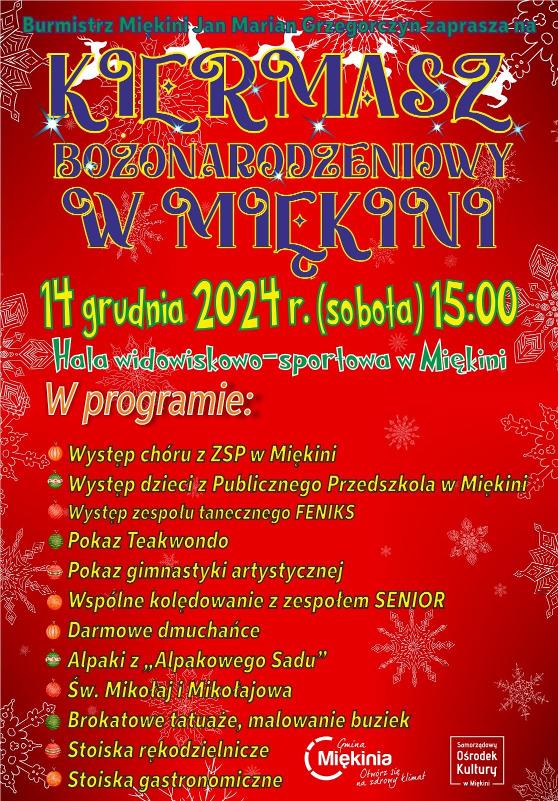 Serdecznie zapraszamy na Kiermasz Bożonarodzeniowy do Miękini! W najbliższą sobotę, 14 grudnia od godziny 15:00.