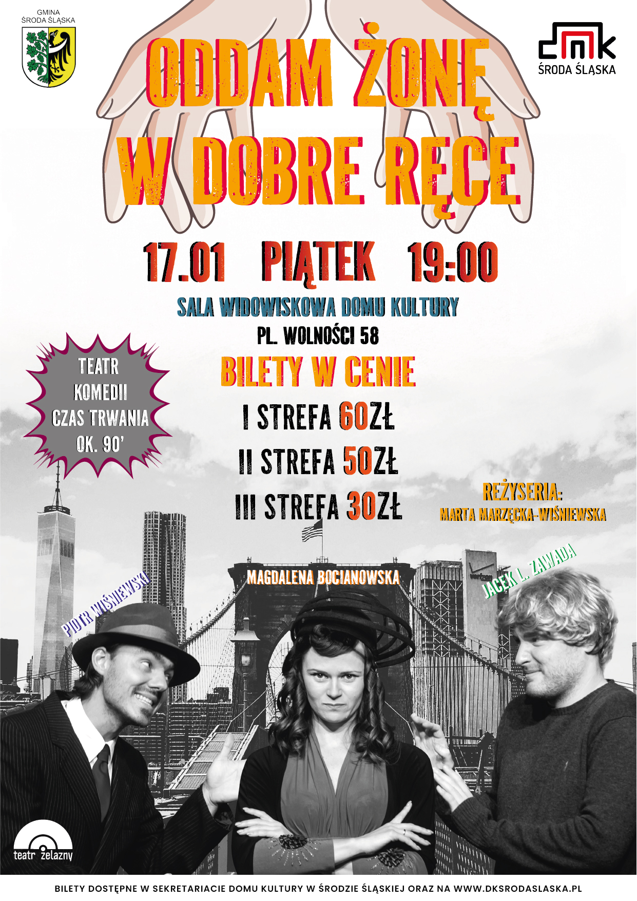 Zapraszamy na noworoczny spektakl komediowy „Oddam żonę w dobre ręce” w wykonaniu aktorów sprawdzonego na naszych scenicznych deskach Teatr Żelazny.