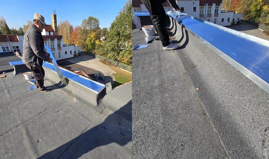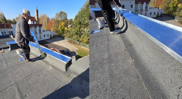 Na zlecenie Gminy wykonano izolację termiczną stropodachu z zastosowaniem styropapy, wymieniono obróbki blacharskie okapów i ogniomurów wraz z wykonaniem konstrukcji pod wyprofilowanie właściwych spadków i wymieniono skorodowaną instalację odgromową i kominki wentylacyjne.