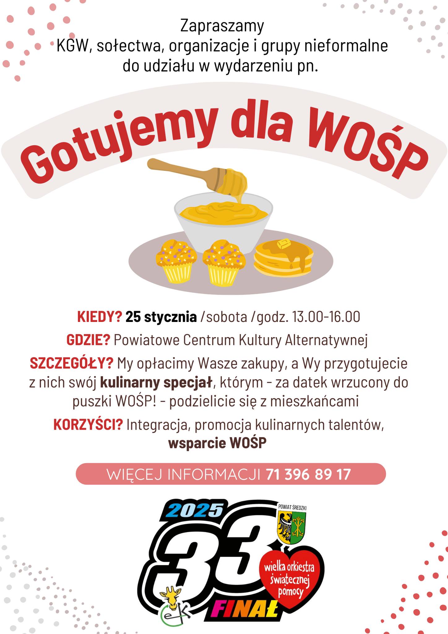 Już niedługo 33 Finał Wielkiej Orkiestry Świątecznej Pomocy. Jeśli chcesz wesprzeć zbiórkę, pochwalić się kulinarnym talentem i spędzić ciekawie sobotnie popołudnie zapraszamy do udziału w wydarzeniu pn. Gotujemy dla WOŚP!