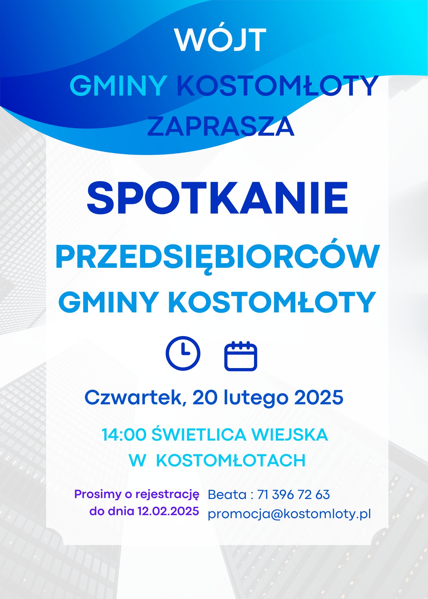 Wójt gminy Kostomłoty Edward Kulig zaprasza osoby prowadzące na terenie gminy Kostomłoty działalność gospodarczą na spotkanie, które będzie okazją do wymiany doświadczeń, wskazaniem potrzeb, wyartykułowaniem istniejących problemów i wyznaczeniem kierunków współpracy między sektorem gospodarczym a sektorem publicznym.