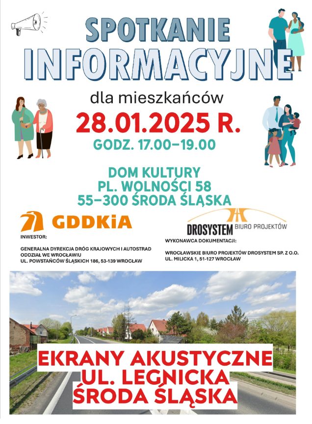 Generalna Dyrekcja Dróg Krajowych i Autostrad (GDDKiA) zaprasza mieszkańców na spotkanie w sprawie realizowanej inwestycji “Budowa zabezpieczeń przeciwhałasowych wzdłuż DK94 w m. Środa Śląska”