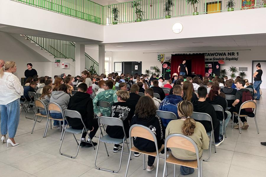 Młodsza widownia zapoznała się z historią Mruczka - kota, który bał się myszy. Mruczek zaprezentował dzieciom spektakl nie tylko o przyjaźni i współpracy, ale także o odpowiedzialnym korzystaniu z technologii oraz o szacunku dla różnorodności i potrzeb innych istot.