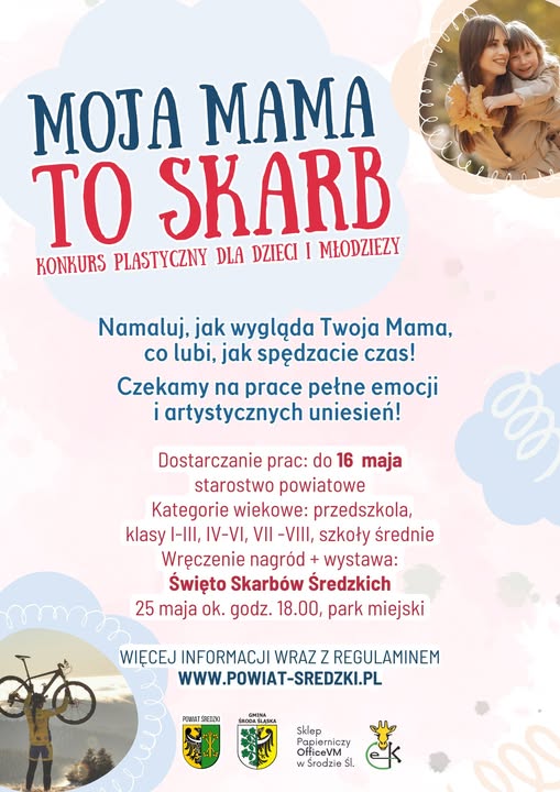 Zbliża się jedno z najpiękniejszych świąt w roku – Dzień Mamy. Z tej okazji Powiat Średzki zaprasza wszystkie dzieci do udziału w wyjątkowym konkursie plastycznym pod hasłem „Moja Mama to Skarb”.