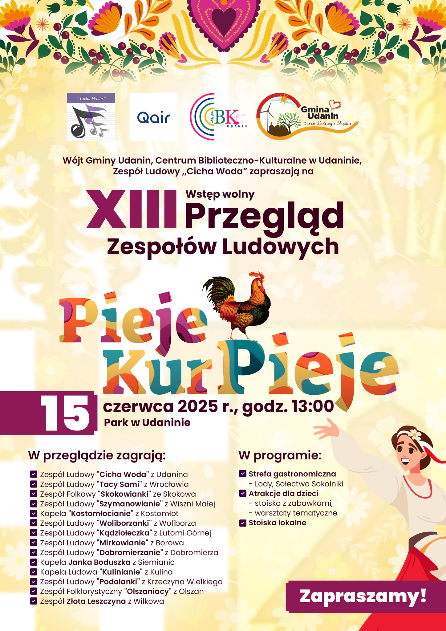 Wójt Gminy Udanin, Centrum Biblioteczno-Kulturalne w Udaninie oraz Zespół Ludowy „Cicha Woda” zapraszają na jedno z najbardziej barwnych wydarzeń w regionie – XIII Przegląd Zespołów Ludowych pod hasłem „Pieję Kur Pieję”. To święto folkloru, które co roku przyciąga miłośników muzyki ludowej z całego Dolnego Śląska i nie tylko.