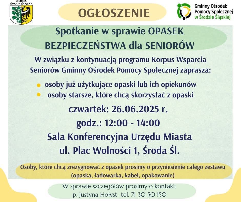 W czwartek, 26 czerwca 2025 r., w godzinach od 12:00 do 14:00 w sali konferencyjnej Urzędu Miasta w Środzie Śląskiej odbędzie się spotkanie dotyczące opasek bezpieczeństwa dla seniorów.