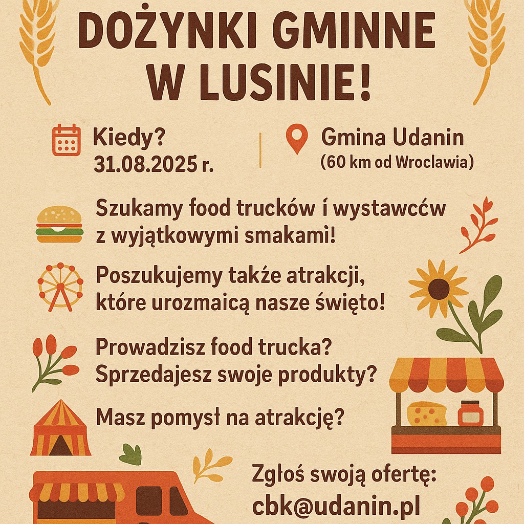 Już 31 sierpnia 2025 roku w miejscowości Lusina w gminie Udanin odbędą się tradycyjne Dożynki Gminne. To wyjątkowa okazja, aby wspólnie świętować zakończenie żniw, bawić się w rodzinnej atmosferze i skosztować regionalnych przysmaków.