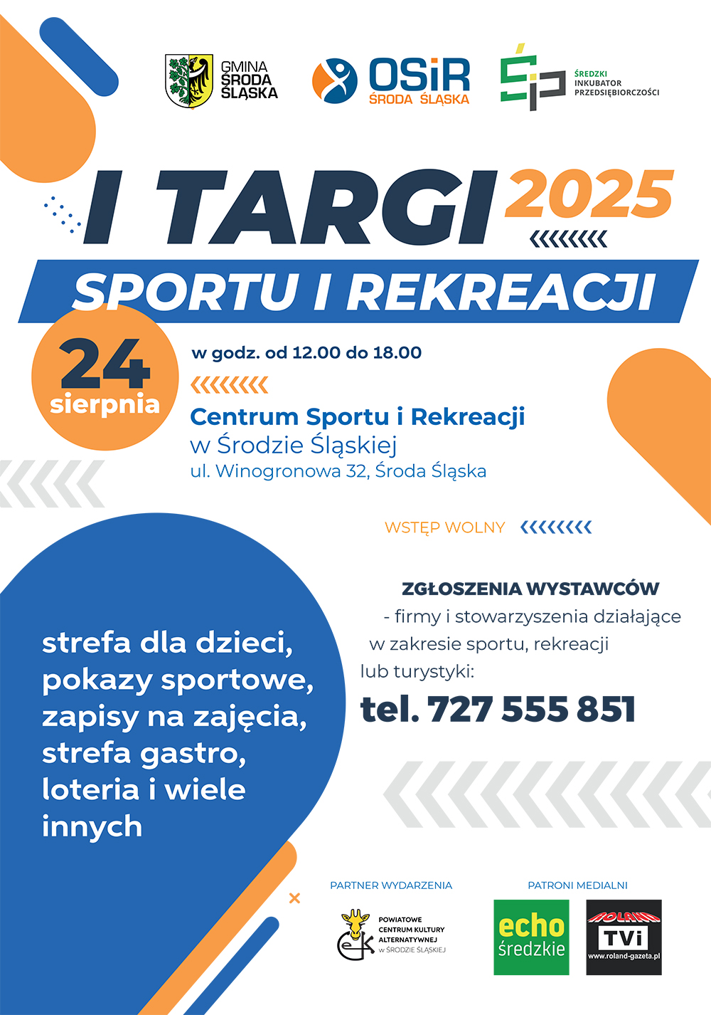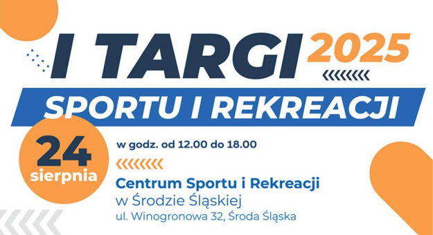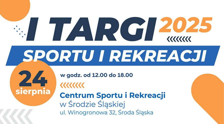 Już 24 sierpnia 2025 r. serdecznie zapraszamy na wyjątkowe wydarzenie – I Targi Sportu i Rekreacji, które odbędą się w Centrum Sportu i Rekreacji ul. Winogronowej 32 w Środzie Śląskiej.