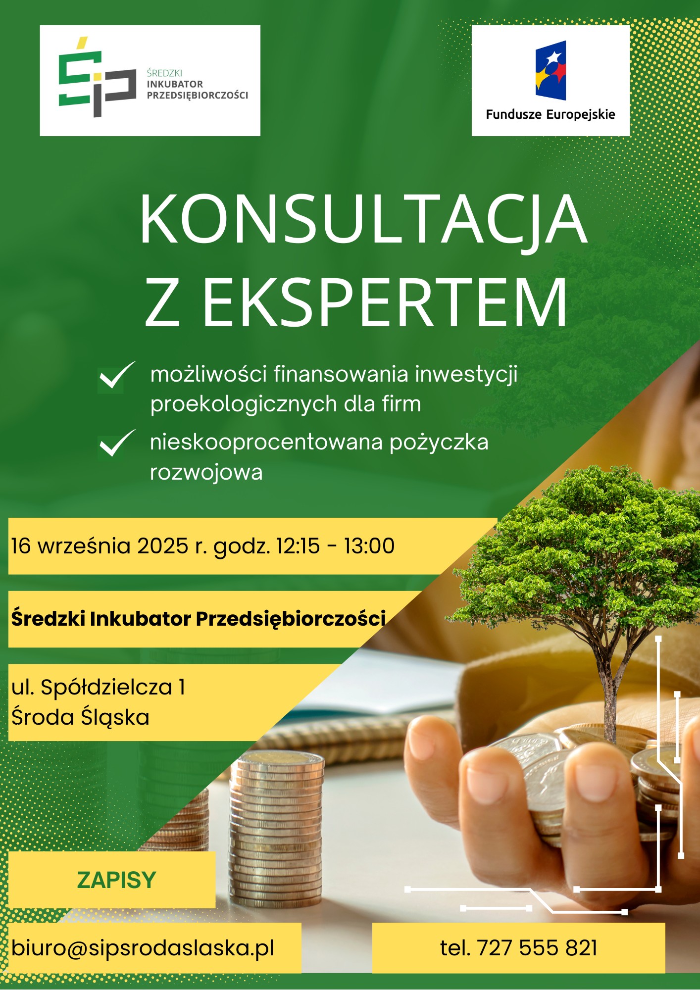 Średzki Inkubator Przedsiębiorczości zaprasza przedsiębiorców na konsultacje z ekspertem, które odbędą się 16 września 2025 r. w godz. 12:15–13:00 w siedzibie przy ul. Spółdzielczej 1 w Środzie Śląskiej.