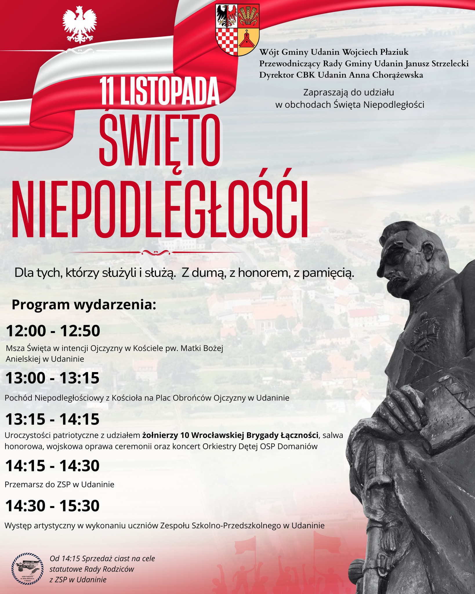 Wójt Gminy Udanin Wojciech Płaziuk, Przewodniczący Rady Gminy Udanin Janusz Strzelecki oraz Dyrektor Centrum Biblioteczno-Kulturalnego w Udaninie Anna Chorążewska zapraszają mieszkańców do wspólnego uczczenia Narodowego Święta Niepodległości.