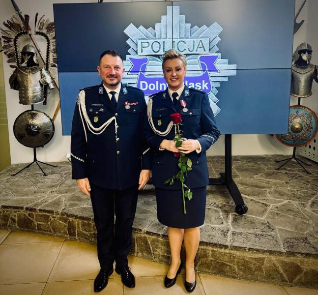 Wśród wyróżnionych nie zabrakło funkcjonariuszki z Komendy Powiatowej Policji w Środzie Śląskiej, której towarzyszył Komendant Powiatowy Policji w Środzie Śląskiej mł. insp. Artur Dobrowolski.