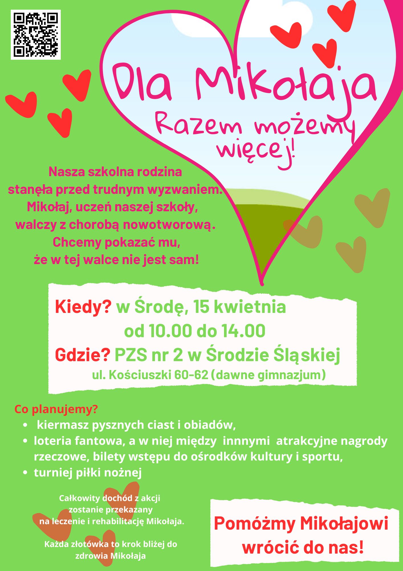 Całkowity dochód z wydarzenia zostanie przeznaczony na wsparcie leczenia chłopca. Organizatorzy podkreślają, że nawet najmniejsza pomoc ma ogromne znaczenie, każda złotówka przybliża Mikołaja do powrotu do zdrowia.