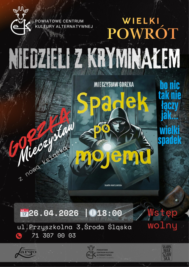 Po przerwie wraca jedno z najbardziej wyczekiwanych wydarzeń dla miłośników literatury. Już 26 kwietnia 2026 roku o godzinie 18:00 sala Powiatowego Centrum Kultury Alternatywnej ponownie wypełni się klimatem tajemnicy i kryminalnych zagadek.