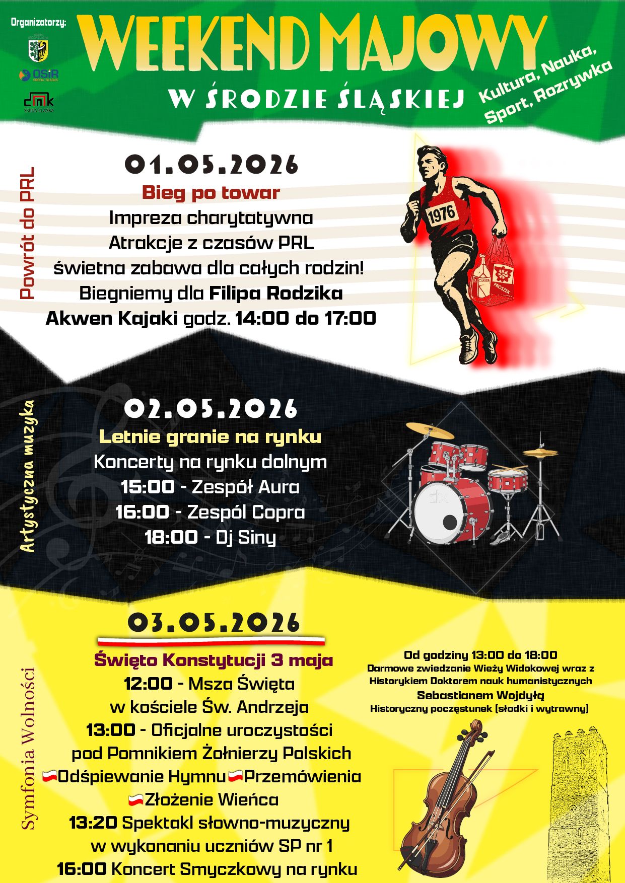 Środa Śląska szykuje się na wyjątkowy Weekend Majowy 2026. W dniach 1–3 maja mieszkańcy i goście będą mogli skorzystać z bogatego programu wydarzeń łączących sport, kulturę, muzykę i patriotyczne uroczystości.