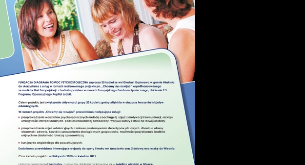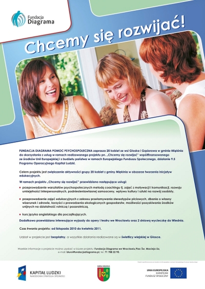 Do kwietnia będą trwały zajęcia o charakterze edukacyjnym dla 20 kobiet ze wsi Głoska i Gąsiorów, które biorą udział w projekcie „Chcemy się rozwijać” realizowanym przez Fundację Diagrama z Wrocławia współfinansowanym przez Unię Europejską w ramach Programu Operacyjnego Kapitał Ludzki, Działanie 9.5 Oddolne inicjatywy edukacyjne na obszarach wiejskich.