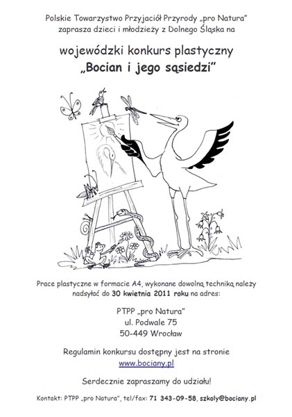 Polskie Towarzystwo Przyjaciół Przyrody „pro Natura” serdecznie zaprasza dzieci i młodzież z terenu województwa dolnośląskiego do wzięcia udziału w konkursie plastycznym pt. „Bocian i jego sąsiedzi”.