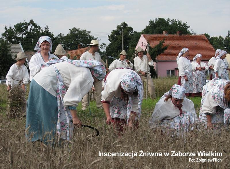 Imprezę rozpoczęła inscenizacja, w której zaprezentowano żniwa dawnymi metodami. Grupa mieszkańców przedstawiła zbiór zbóż sierpami, kosami i młockę cepami jak również staropolskie zwyczaje: pasowania gospodarza i wykonania przepiórki z ostatnich pozostających po żniwach kłosów zbóż. Żniwiarzom towarzyszyli Lubiąscy Cystersi oraz Chór Uniwersytetu III Wieku, który swoimi pieśniami ubarwił całość inscenizacji. Widzowie mogli brać udział w konkurencjach robienia powróseł, rzutem snopka na odległość, młocki cepem na czas. Zwycięzcy i pozostali uczestnicy otrzymali nagrody. Impreza finansowana była przez Gminę Miękinia.