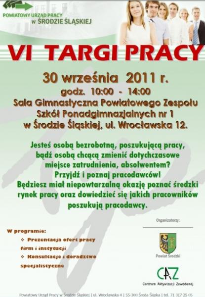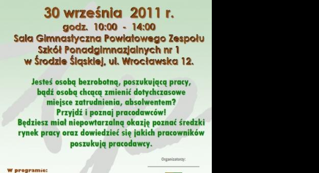 Powiatowy Urząd Pracy zaprasza do udziału w VI Targach Pracy, które odbędą się 30 września w Zespole Szkół Ponadgimnazjalnych nr 1 w Środzie Śląskiej, ul. Wrocławska 12 w godz. 10:00 do 14:00.