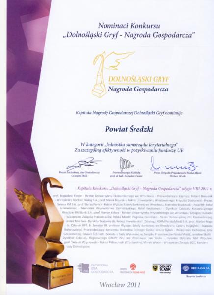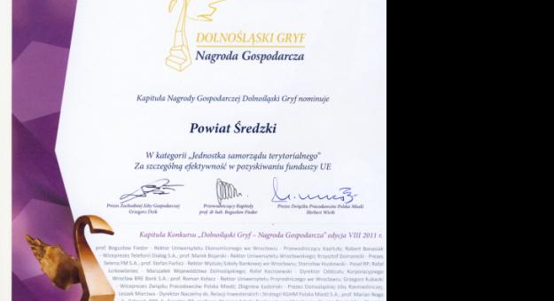 Powiat Średzki znalazł się w gronie nominowanych w konkursie „Dolnośląski Gryf – Nagroda Gospodarcza”. Do zwycięstwa zabrakło mu jednak kilku punktów.