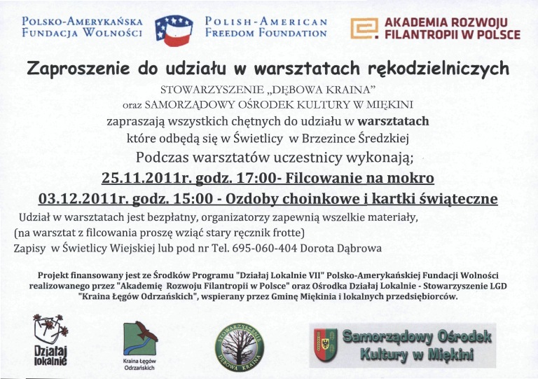 Stowarzyszenie „Dębowa Kraina" oraz Samorządowy Ośrodek Kultury w Miękini zapraszają wszystkich chętnych do udziału w warsztatach, które odbędą się w świetlicy w Brzezince Średzkiej.