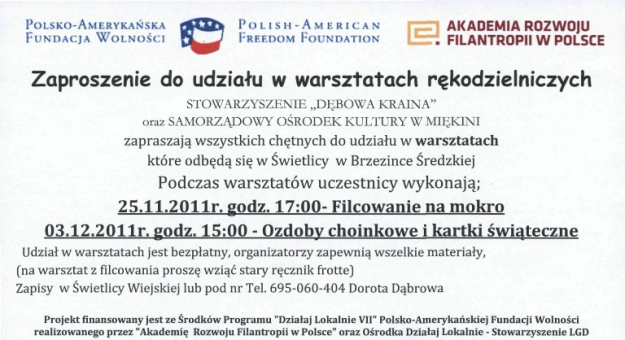 Udział w warsztatach jest bezpłatny, organizatorzy zapewnią wszelkie materiały (na warsztat z filcowania proszę wziąć stary ręcznik frotte). Zapisy w Świetlicy Wiejskiej lub pod nr tel. 695-060-404, Dorota Dąbrowa.