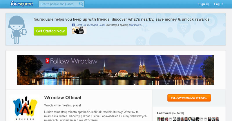 Aby móc korzystać z Foursquare należy dokonać darmowej rejestracji klikając w przycisk „Follow Wrocław Official” na stronie www.foursquare.com/wroclaw_info.