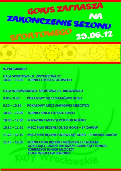 W sobotę, 23 czerwca, zawodnicy z sekcji sportowych Gminnego Ośrodka Kultury i Sportu w Kątach Wrocławskich podsumują miniony sezon 2011/2012. Na dwóch halach sportowych będą rozgrywane turnieje oraz mecze pokazowe m.in. tenisa stołowego, piłki siatkowej oraz piłki nożnej.