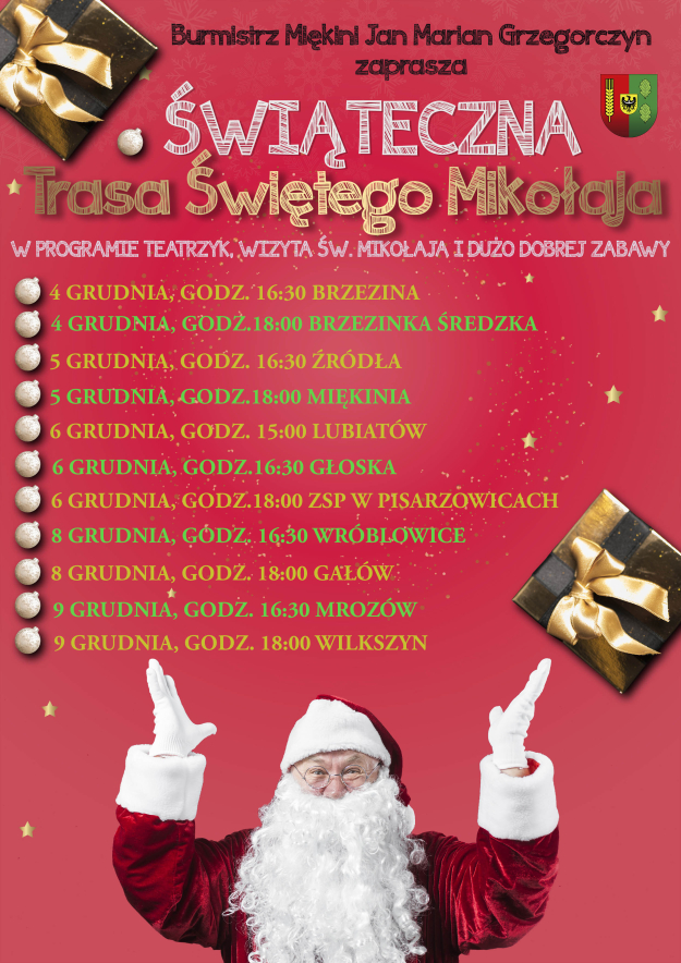 Gmina Miękinia szykuje wyjątkowe spotkania ze Świętym Mikołajem. Od 4 do 9 grudnia Mikołaj odwiedzi kolejne miejscowości, a w programie każdego wydarzenia zaplanowano teatrzyk, wizytę Świętego oraz sporą dawkę świątecznej zabawy.