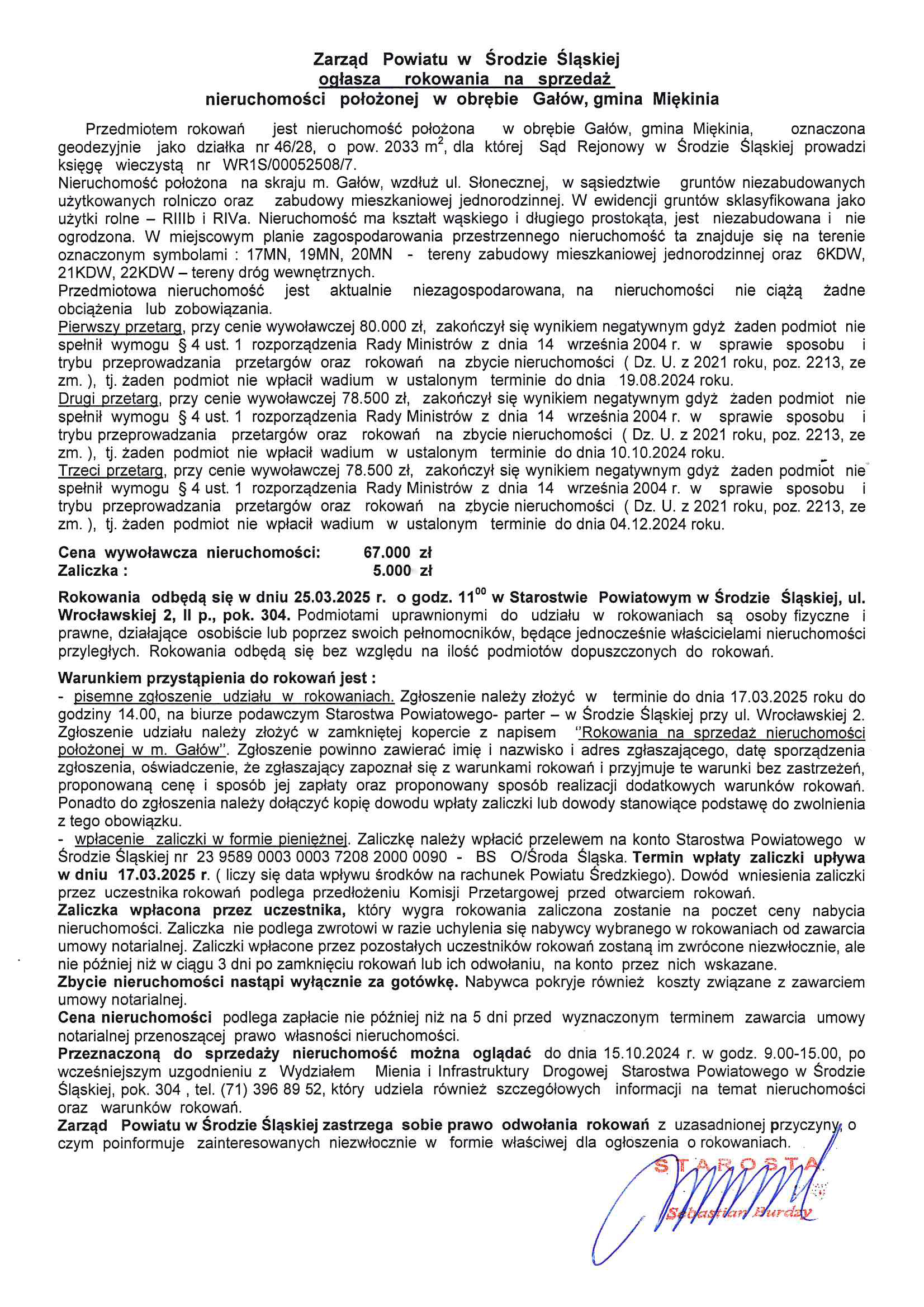 strona główna przetargi Zarząd Powiatu w Środzie Śląskiej ogłasza rokowania na sprzedaż nieruchomości w Gałowie